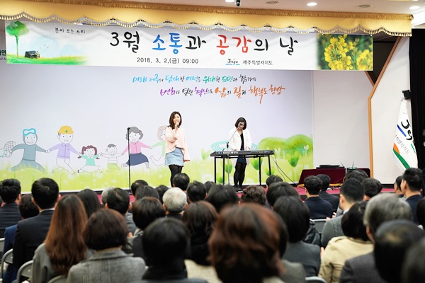 이날 진행된 소통과 공감의 날 식전 행사 문화공연에서는 제주출신 여성 2인조 '홍조밴드'를 초청, 다함께 봄 노래를 부르는 즐거운 시간도 가졌고 도정 발전 유공자에 대한 표창이 진행됐으며, 전국 우수사례로 주목받고 있는 제주형 공동육아 돌봄정책 '수눌움 육아나눔터'에 대한 공유도 이뤄졌다.
