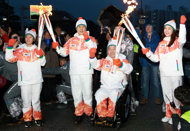 강릉시청에서 진행된 이날 성화봉송에는 김정태 하나금융그룹 회장과 전선주 대한장애인체육회 훈련육상부장이 함께 주자로 참가했다.