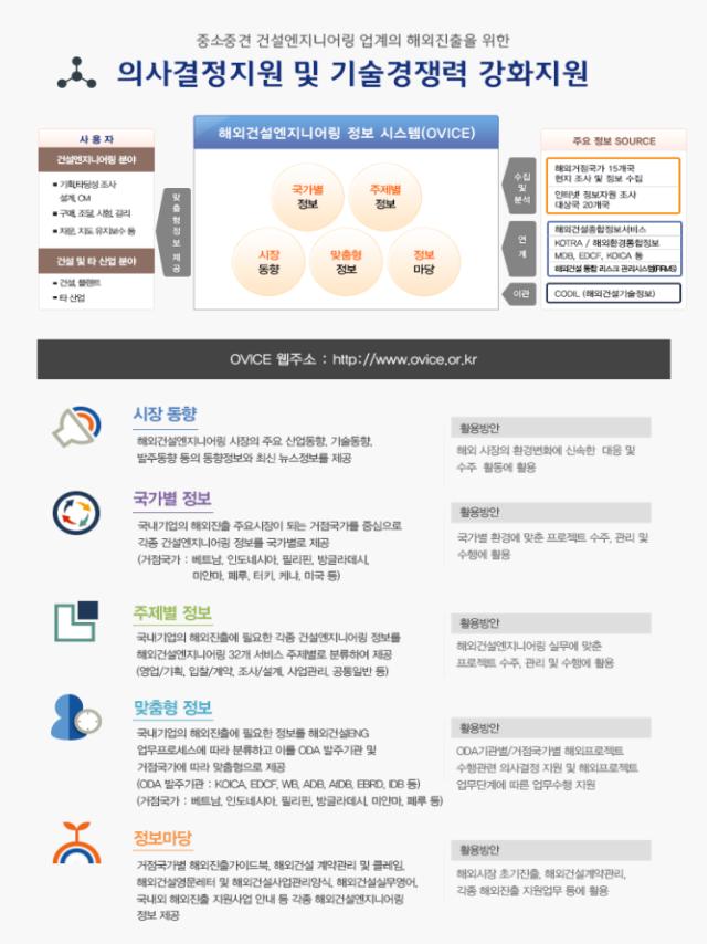 해외건설엔지니어링 정보시스템(OVICE)은 해외 진출 대상 국가에 대한 정보 수집에 어려움을 겪고 있는 우리나라 중소·중견 건설엔지니어링 기업을 지원하기 위해 2014년부터 연구개발(R&D) 사업으로 추진 중인 정보제공 시스템이다.