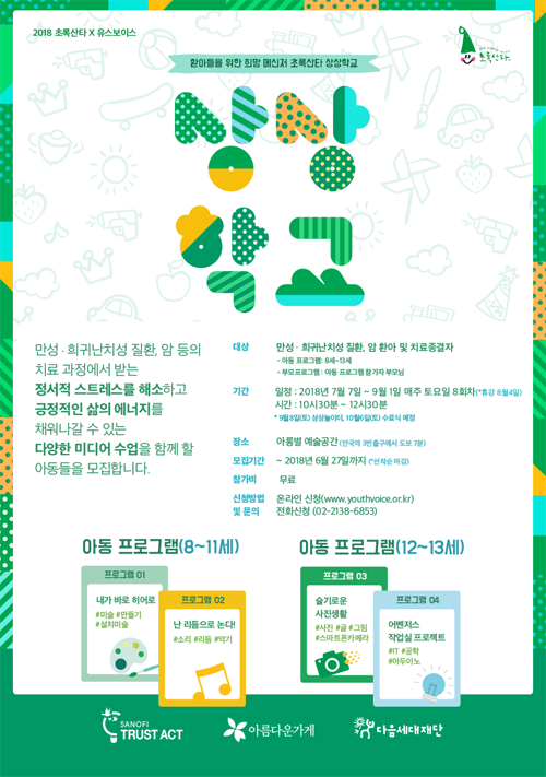 서울 종로구에 위치한 ‘아롱별 예술공간’에서 진행되는 ‘2018 초록산타 상상학교’는 만성질환, 희귀질환, 암 등 신체적 아픔을 겪는 아이들이 정서적 스트레스를 해소하고, 자존감을 키워 건강한 어른으로 성장할 수 있도록 지원하는 문화예술 프로그램이다.