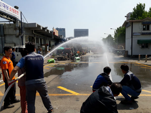 이번 훈련은 특히 도매권 채소시장 유통 종사자들이 소화전, 소화기를 능숙하게 사용해 신속하게 초기대응을 하는데 중점에 두고 사용법 교육 및 실습을 실시했다. 이날 실습에는 교육용 연기소화기, 물소화기, 분말소화기가 이용됐다.