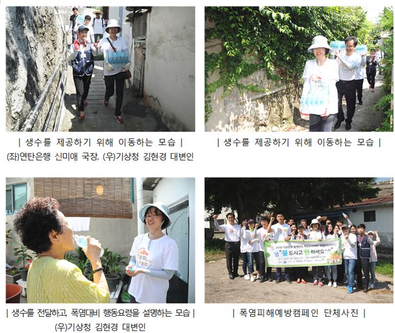 기상청과 밥상공동체 연탄은행은 7~8월 중 전국 9개 지역에서 취약계층에 생수와 홍보물을 배부하며 폭염 정보 활용 방법과 폭염 행동요령을 알리고 있다.