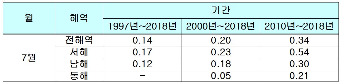 특히 서해는 7월 월평균 수온이 1997년 이후 연 0.17℃씩 오르다가 2010년부터 연 0.54℃씩 증가해 가장 큰 상승폭을 보였고, 남해와 동해의 7월 월평균 수온은 각각 연 0.30℃와 0.21℃씩 증가한 경향을 보였다.