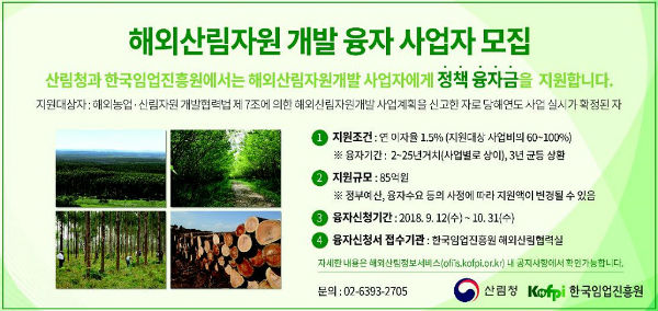 [환경일보] 최인영 기자 = 산림청(청장 김재현)과 한국임업진흥원(원장 구길본)이 국내 기업의 해외조림투자 확대와 산림자원개발 활성화를 위해 오는 10월31일까지 ‘제3차 해외산림자원개발 정책 융자금’ 지원 사업자를 모집한다.