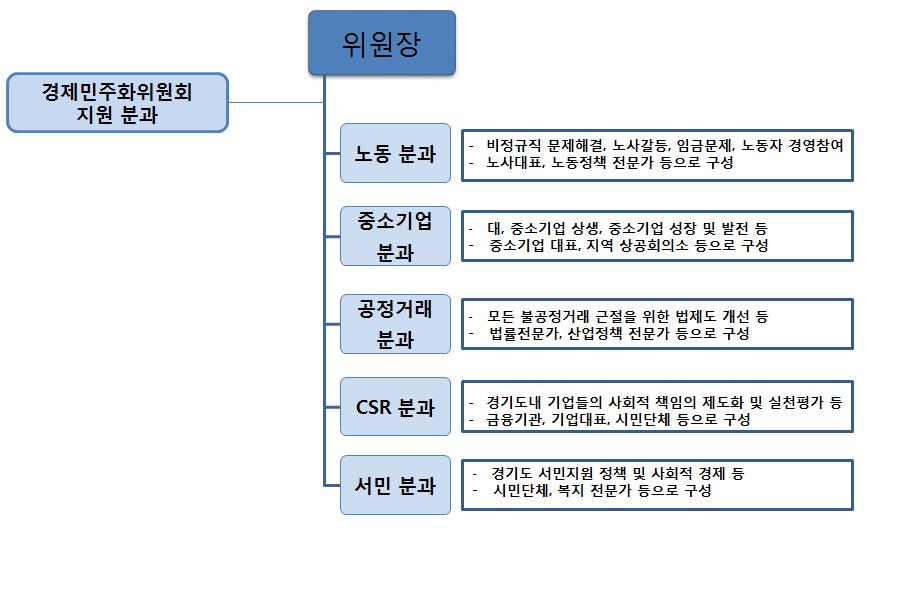 이에 따로 도는 ▷기존 위원장을 포함해 13명 이내였던 위원회를 위원장을 포함한 30명으로 확대 ▷노동, 중소기업, 공정거래, CSR(Corporate Social Responsibility, 기업의 사회적 책임), 서민 등 5개 분과 설치 ▷매 5년 마다 경제민주화 기본계획 수립 의무화 등을 주요 내용으로 하는 ‘경기도 경제민주화 지원 등에 관한 조례’ 개정에 착수했다.