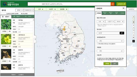 생물지리정보서비스는 국립생물자원관이 2007년부터 조사해 종 식별을 끝낸 생물표본의 채집 위치자료 80만여건을 지도 위에 시각화한 것이다.
