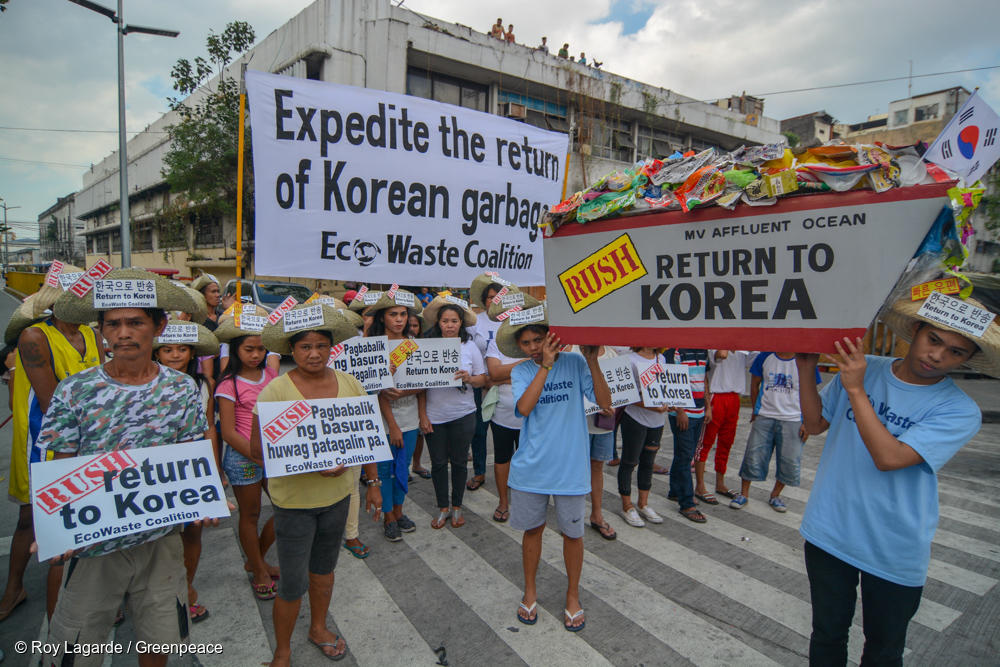 시위 참가자들은 영어와 한국어로 적힌 현수막과 쓰레기 배 조형물을 앞세우고 가두행진을 벌이며 한국 평택 들어온 플라스틱 쓰레기를 서둘러 한국으로 반송할 것을 요구했다.