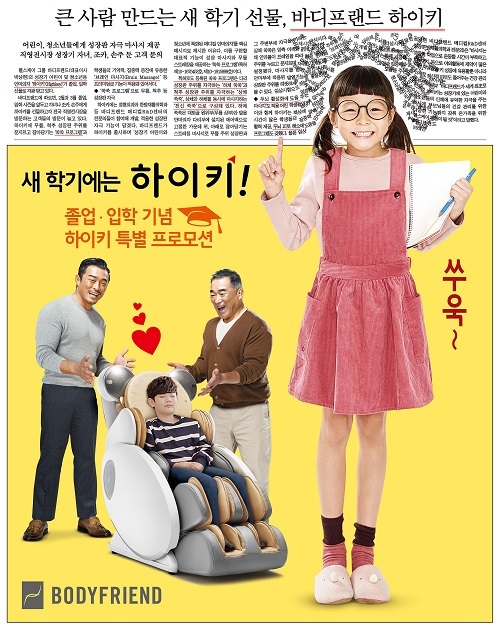 바디프랜드 관계자는 “졸업과 입학 시즌을 맞아 자녀나 조카, 손주에게 하이키를 선물하고자 전국 직영전시장을 방문하는 고객들이 늘고 있다. 하이키 안마의자가 새로운 시작을 준비하는 고객님들께 학습과 성장, 건강을 한번에 잡을 수 있는 선물이 되길 바란다”고 말했다.