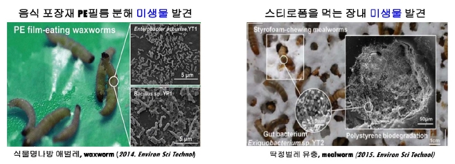 최근 플라스틱 분해 생물이 등장해 학계의 주목을 받고 있다. 바로 음식 포장재 PE필름을 분해하는 식물명나방 애벌레와 스티로폼을 먹는 장내 미생물 딱정벌레 유충이다.