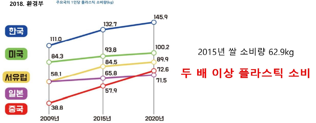 한국이 플라스틱 소비 대국이 된 이유에 대해 그는 “천연자원 부재에도 초고속 성장을 이룬 배경에는 70~80년대 중화학 공업 위주의 경제성장 정책이 있었다”며 “중화학 공업의 성장은 우리에게 플라스틱 풍류를 가져다주었지만 오늘날 플라스틱 재앙을 초래했다”고 주장했다.