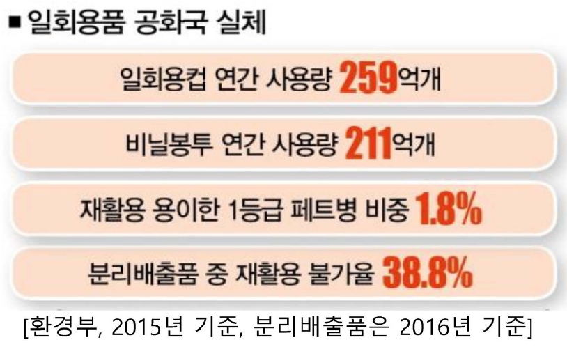 지난해 환경부는 중국의 폐기물 수입 중단에 따른 재활용쓰레기 대란을 겪으며, 이를 해결하고자 8월부터 자원재활용법에 따라 카페 내 일회용컵 사용 규제 등의 정책을 펴고 있다.