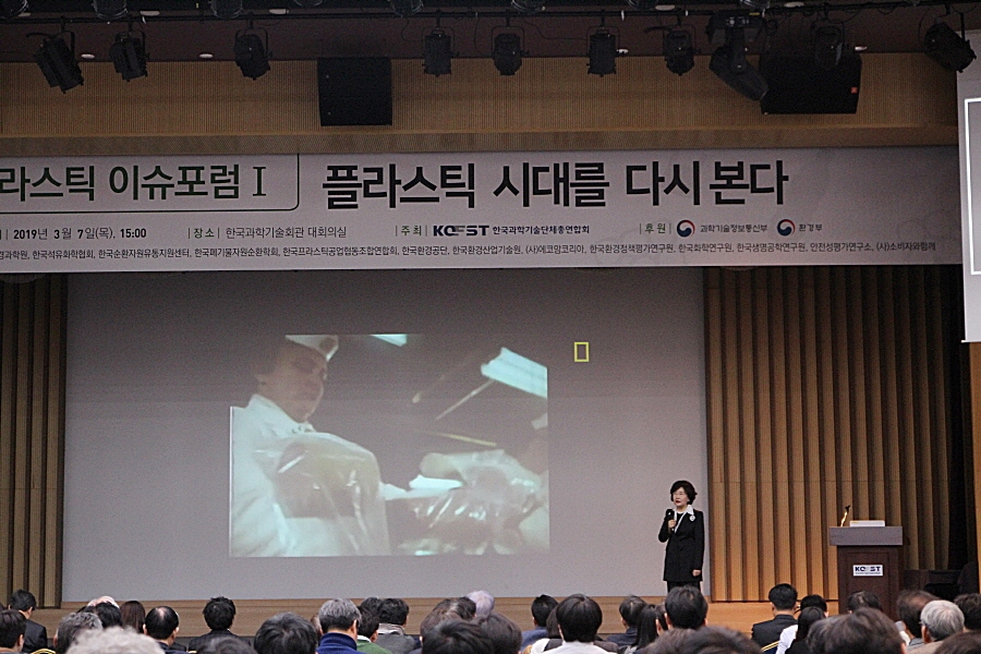 김명자 한국과학기술단체총연합회 회장은 기조연설을 통해 제2차 세계대전 이후 인류는 값싸고 가볍고 다양한 물성을 지닌 플라스틱을 통해 인류문명 재건에 성공했고, 이로써 ‘플라스틱 시대(Plastic Age)’를 맞이했다고 말문을 열었다.