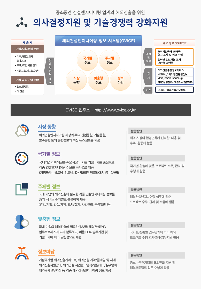 OVICE는 해외진출 시 필수적인 업무정보 수집에 어려움을 겪고 있는 국내 중소·중견 건설기업을 지원하기 위해 지난 2016년부터 서비스를 개시한 정보제공 시스템이다. 해외진출 대상국가의 법·제도, 인허가, 입찰·계약, 설계, 사업관리(자재·장비·노무·세금) 등 기술정보 및 실제 사례를 홈페이지를 통해 구체적으로 제공함으로써 해외 국가별 정보 입수에 어려움을 겪는 중소기업에 단비가 되고 있다.