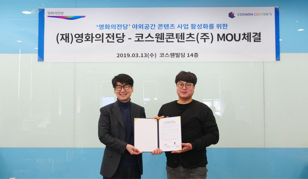 [부산=환경일보] 권영길 기자 = (재)영화의전당과 코스웬콘텐츠(주)는 3월13일 코스웬빌딩 14층에서 ‘영화의 전당 야외공간 콘텐츠사업 활성화를 위한 업무협약(MOU)’을 체결했다.
