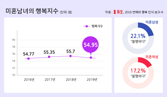 한국 미혼남녀 행복도는 100점 만점에 54.95점으로 전년(55.7점) 대비 하락했다. 이를 환산하면, 미혼남녀 행복지수는 10점 중 5.495점으로 유엔 산하 자문기구가 발표한 한국의 행복지수(5.895점)보다 낮았다.