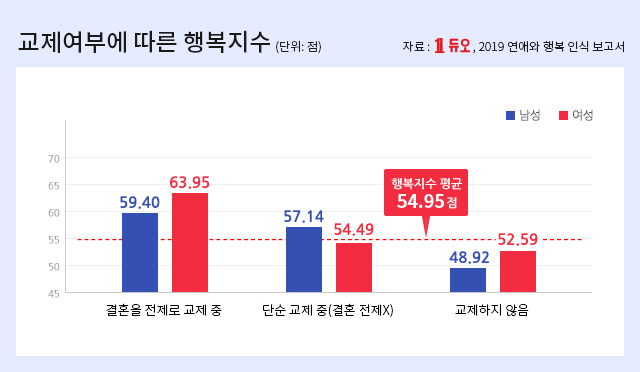 행복 지수는 ‘결혼을 전제로 교제 중(이하 결혼 교제)’일 때 61.9점으로 가장 높았다. 결혼을 전제하지 않은 교제 중일 때 행복지수는 55.74점, 교제하지 않을 때 행복지수는 50.7점이었다. ‘솔로’는 전체 평균치(54.95점)에도 못 미쳤다.