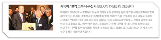 프로그램의 첫 번째 나무를 기증한 창립회원인 반 前총장은 녹색봉사단과 함께 쿠부치사막에서 진행하는 ‘GROUND ZERO’선포 행사에 참석한다.