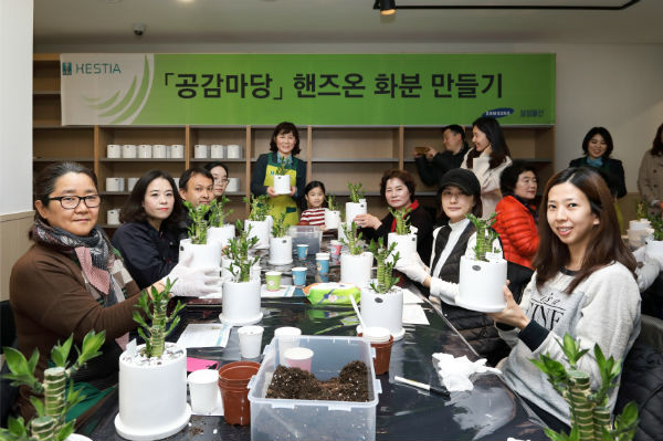 공기청정 화분만들기는 올해 도입한 공감마당 프로그램 중 하나로, 입주민들은 당일 화분 2개를 제작하며 1개는 강동구 자원봉사센터를 통해 지역 사회복지단체에 기부한다. 삼성물산은 올해 상반기 중 11개 래미안 단지에서 공감마당 활동을 시행할 예정이다.