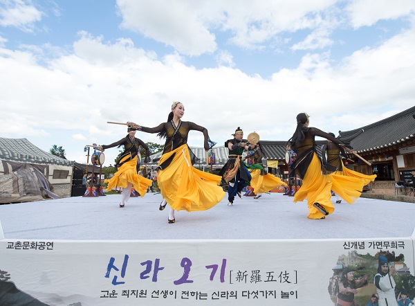 5월 4일 토요일 오후 3시 교촌한옥마을 광장에서 ‘신라오기’ 공연이 열린다. 신라오기는 최치원의 절구시 ‘향악잡영’ 5수에서 읊어진 금환(저글링), 대면(무용), 산예(사자춤), 월전(가면극), 속독(무용) 등 다섯가지 놀이와 신라 역사를 모티브로 관객들과의 재담과 놀이가 어우러져 장르를 뛰어넘는 신개념 가면무희극이다. 한마디로 전통 연희의 종합선물세트라 할 수 있다.