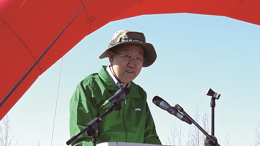 이번엔 특히 반기문 제8대 유엔사무총장이 참가해 눈길을 끌었다. 반 전 총장은 조림활동 현장에서 “10년 넘게 초심을 잃지 않고 계속된 쿠부치 사막 식수는 높이 평가돼야 한다”면서 한중 청년들과 관계자들에게 감사하고 사막화방지를 위한 보다 적극적인 활동을 촉구했다. 또한, “금년 보아오 포럼에서도 인류가 어떻게 환경문제를 해결해서 함께 잘 살 수 있을까가 중요한 현안이었는데 시진핑 주석은 누구보다 높은 열정과 관심을 보였다”고 설명했다. 반 전 총장은 매년 1200만ha의 땅이 사막화되는 현실을 안타까워하면서 “10년 후 쿠부치 사막을 기대하며 모두 힘을 합쳐 세대를 이어갈 보금자리 마련에 노력하자”고 격려했다. 뚜샤우허 달라터치시 공청단 부서기는 “녹색사업은 인류공영의 고귀한 사업이며, 쿠부치 사막의 녹색화 모델은 유일한 성공사례로 세계적으로 적용이 가능하다”고 자부하면서 “한중 청년들이 함께 노력해 쿠부치 사막을 오아시스로 만들자”고 격려했다. 북경시 공청단 션쉐우 부서기는 “한중 양국은 가까운 이웃으로 오랜 기간 역사를 함께 해왔다. 양국 청년들의 우정도 우리가 심은 나무들이 뿌리 내리듯 굳건한 관계로 자라나길 기대한다”고 소감을 밝혔다. 강영필 제18기 한중녹색봉사단장(KF 기획이사)은 “숲을 가꾸고 환경정의를 지키는 것은 나라를 넘는 과제이며, 한중 청년들의 소통과 우정을 통해 공공외교의 발판이 마련되길 기대한다”고 격려했다.