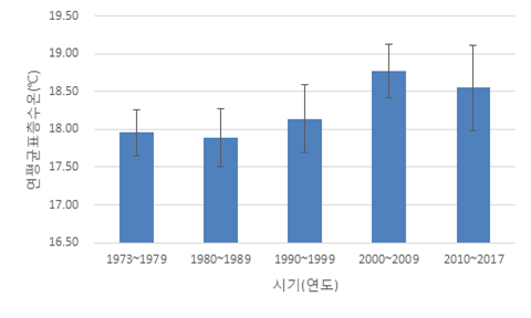 홍도에서 북쪽으로 35㎞ 떨어진 거제도의 연평균 표층수온 변화를 10년 단위로 살펴보면 ▷1973~1979년은 17.96℃ ▷1980~1989년은 17.89℃ ▷1990~1999년은 18.14℃ ▷2000~2009년은 18.77℃ ▷2010~2017년은 18.55℃로 나타났다.