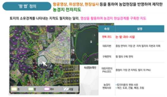 농림축산식품부와 행정안전부, 농촌진흥청은 15일 전국 농경지 전자지도인 ‘팜맵’ 기반의 농업활동 지원정보를 ‘국가 중점 데이터’로 선정하고, 공공데이터포털을 통해 국민에 개방한다고 밝혔다.
