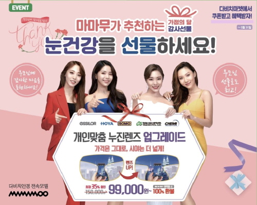 [환경일보] 류정선 기자 = 다비치안경체인(대표 김인규, 이하 다비치안경)은 5월 가정의 달을 맞아 개인맞춤 누진렌즈 업그레이드, 선글라스 초특가 할인 등 다양한 혜택을 제공하는 ‘마마무와 함께하는 가정의 달 감사 이벤트’를 전국 258개 다비치안경 가맹점에서 진행하고 있다고 밝혔다.