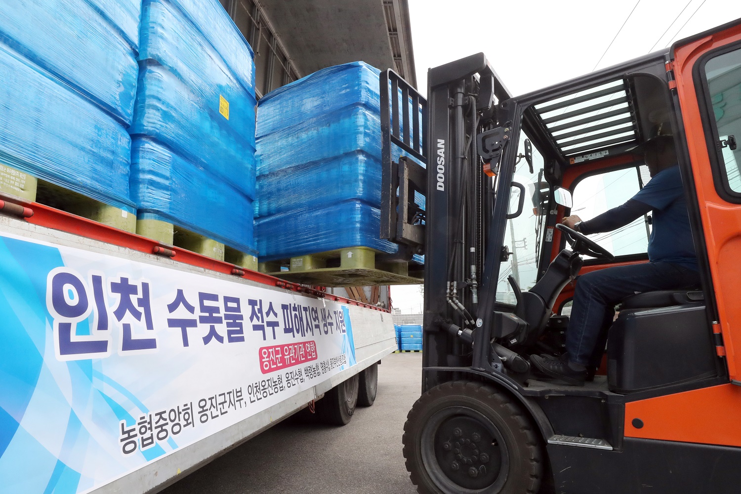 옹진군 유관기관 연합(농협중앙회 옹진군 지부, 인천옹진농협, 옹진수협, 백령농협, 영흥수협, 옹진부천산림조합)은 수돗물로 피해를 입은 중구(영종)·서구 지역에 2,100만원 상당의 생수를 구입하여 사회복지공동모금회에 현물 기탁(영종 1,050만원, 서구 1,050만원)하고 21일 피해지역에 인도를 완료했다.