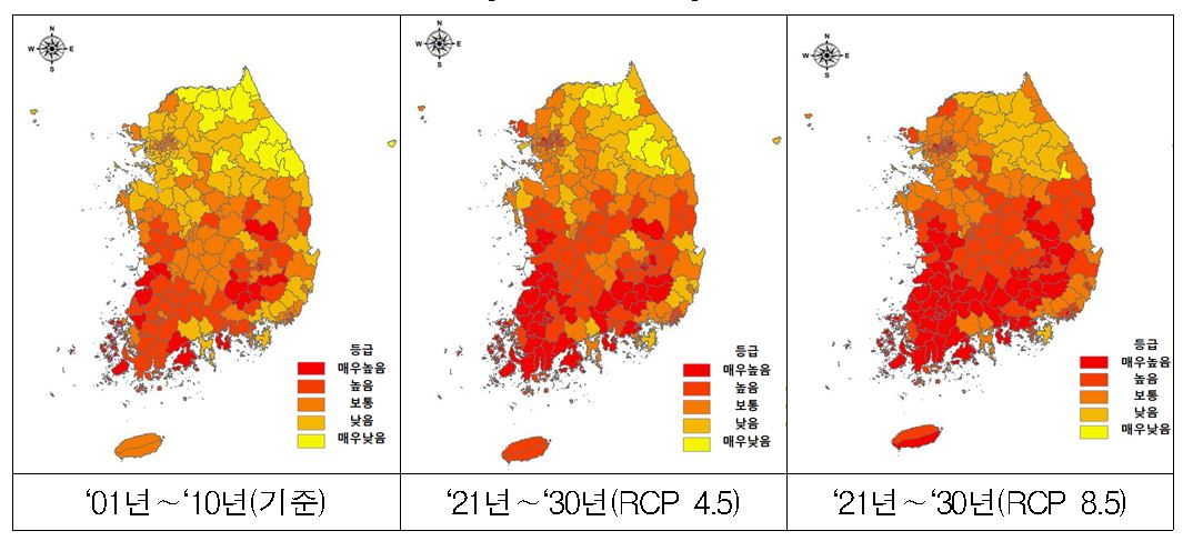 기상청 기후전망 시나리오(RCP 4.5)에 따라 분석한 결과, 우리나라의 2021∼2030년 폭염 위험도는 기준년도(2001∼2010년) 대비 크게 증가할 것으로 예측됐다.