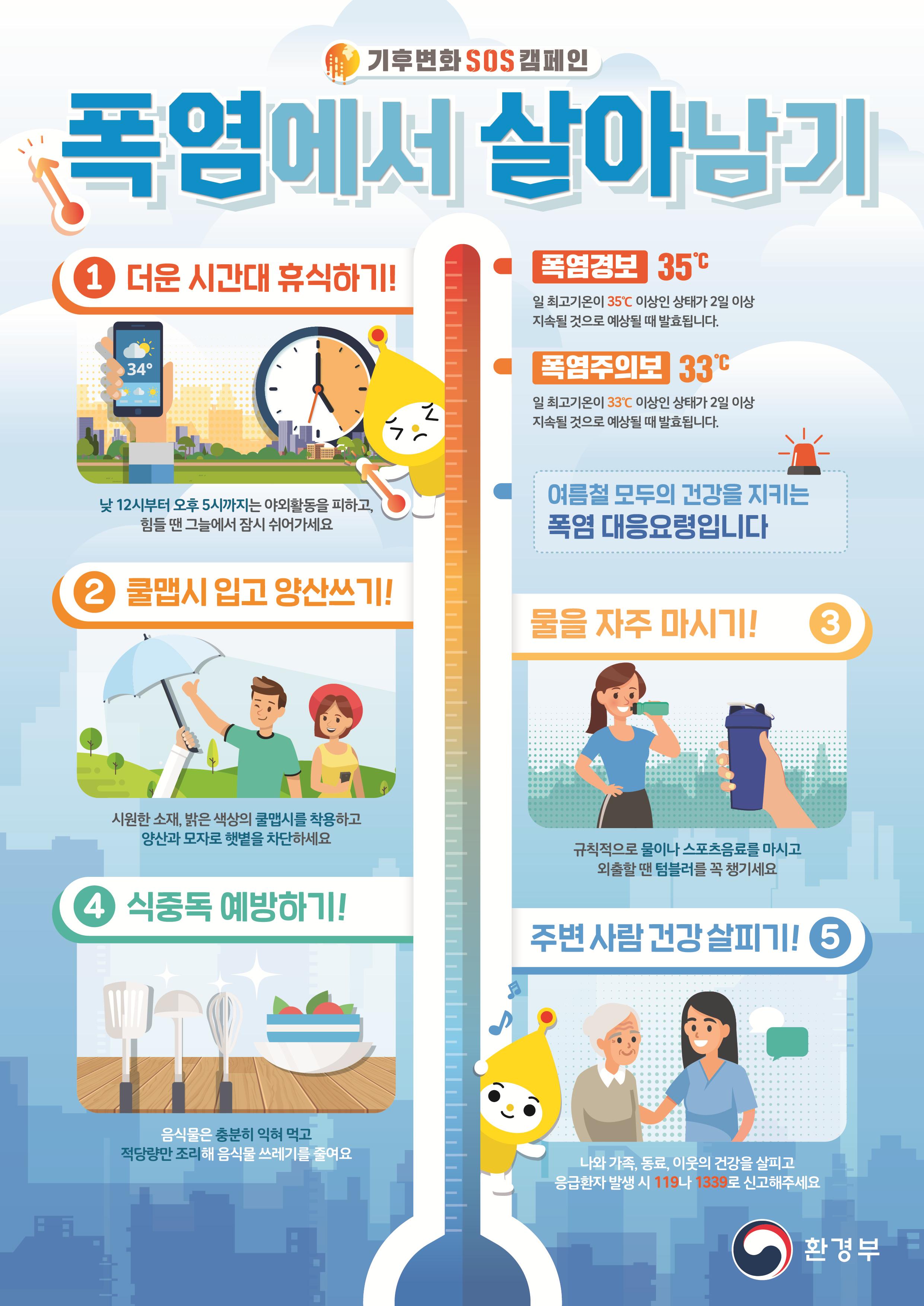 폭염 행동요령은 ▷ 더운 시간대 휴식하기 ▷ 시원한 옷을 입고 양산 쓰기 ▷ 물을 자주 마시기 ▷ 식중독 예방하기 ▷ 주변 사람 건강 살피기 등이다.