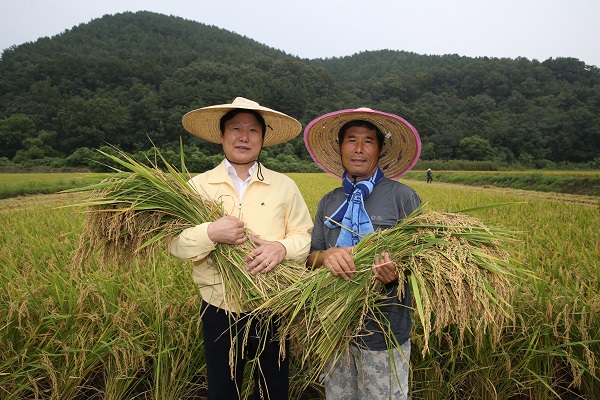 [성주=환경일보] 최달도 기자 = 경북 성주군은 지난 19일 아직 한낮의 뜨거운 열기가 식지 않은 여름의 끝자락에 올 해 첫 벼 베기 행사를 진행했다.