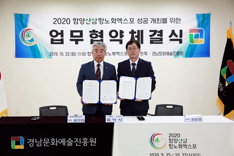 [함양=환경일보] 강위채 기자 = 경상남도 함양군 산삼항노화엑스포 조직위원회(위원장 김경수 경상남도지사)는 지난 22일 경남문화예술진흥원에서 ‘2020 함양산삼항노화엑스포’의 성공적 개최를 위해 상호 협력하기로 하고 업무협약을 체결했다.