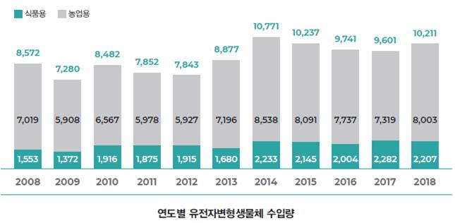 식용 GMO 수입은 지난 2014년 208만8000톤을 기록한 이래, 계속 200만톤을 상회하며 꾸준히 수입이 늘고 있는 추세다.