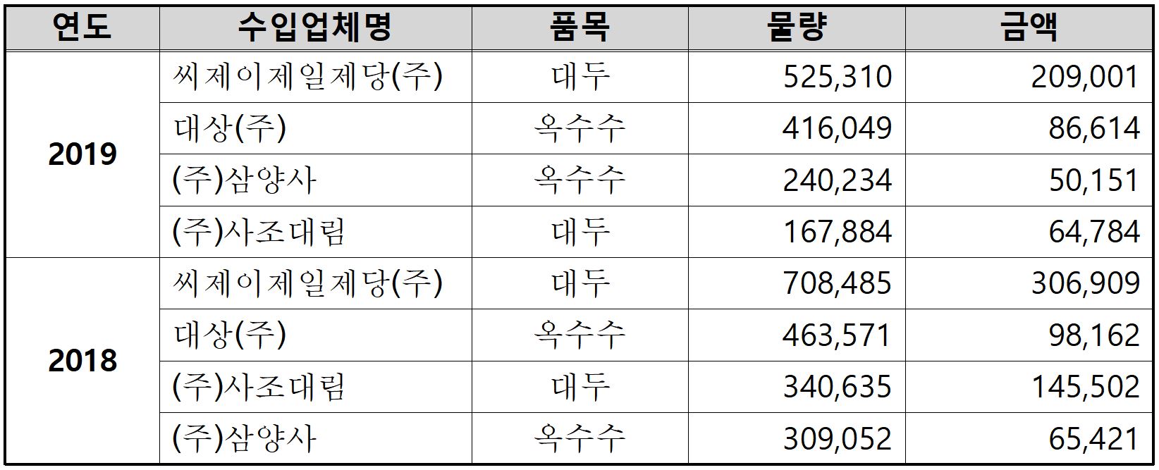 기업별 GMO 수입물량을 따져보면 지난해와 올해 모두 CJ제일제당과 대상이 각각 1‧2위를 차지한 것으로 확인됐다.