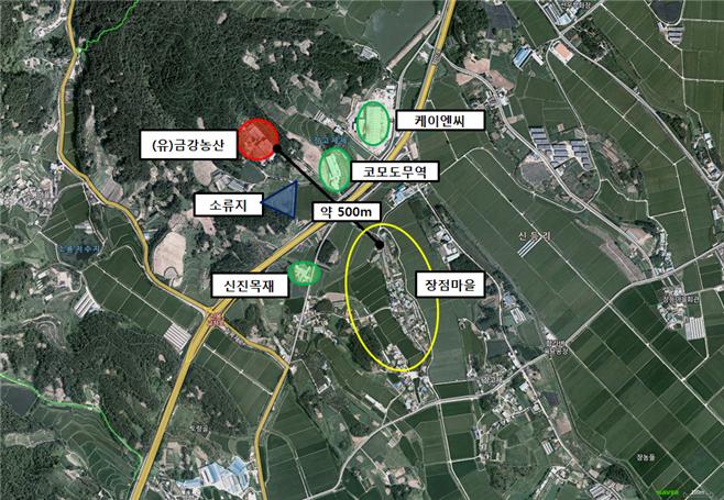 익산 장점마을 건강영향조사 보고서에 따르면 연구진의 유해물질 배출원 조사결과, (유)금강농산에서 비료관리법에 의해 퇴비로만 사용해야 할 연초박(담뱃잎찌거기)을 불법적으로 유기질 비료 생산 공정인 건조공정에 사용했음을 확인했다.
