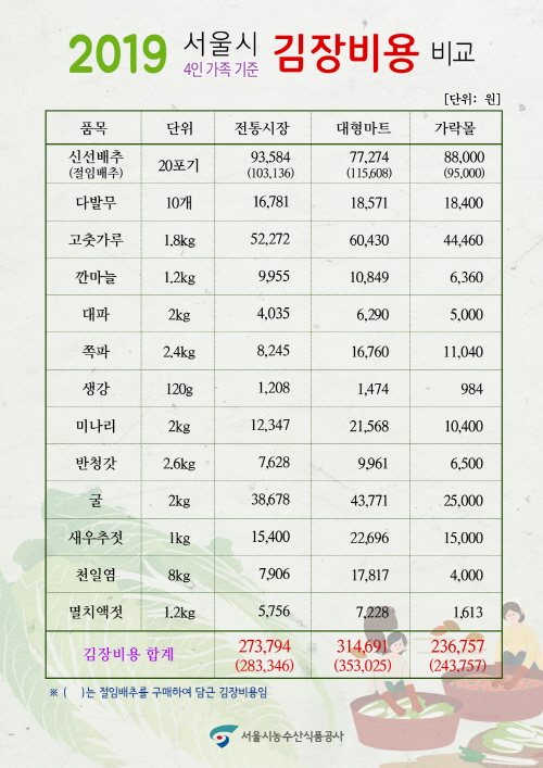[환경일보] 심영범 기자 = 서울시농수산식품공사(사장 김경호, 이하 '공사')는 21일 서울시 25개 자치구 내 전통시장, 대형마트 및 가락시장 내 가락몰 등 총 76곳을 대상으로 4인 가족(배추 20포기 기준) 김장 비용을 조사‧발표했다.