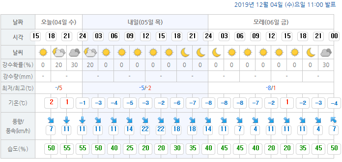 내일(5일) 서울 아침 기온은 -5도, 금요일(6일)인 모레는 무려 -9도까지 하강하며 금년들어 가장 강한 추위가 예상된다.