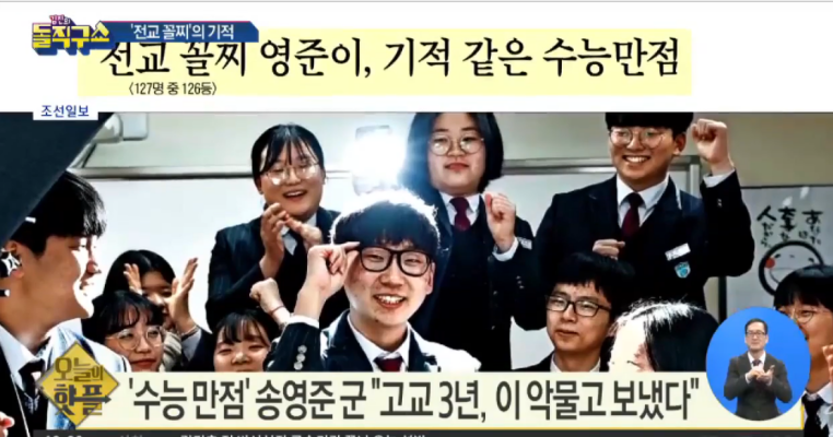오늘 4일 김해외고에 따르면 송영준 학생은 지난 11월 14일 치러진 수능시험에서 국어, 수학(나), 사회탐구2과목(한국지리, 사회문화)에서 만덤을, 점수없이 등급만 발표되는 영어와 한국사에서도 1등급을 받았다고.