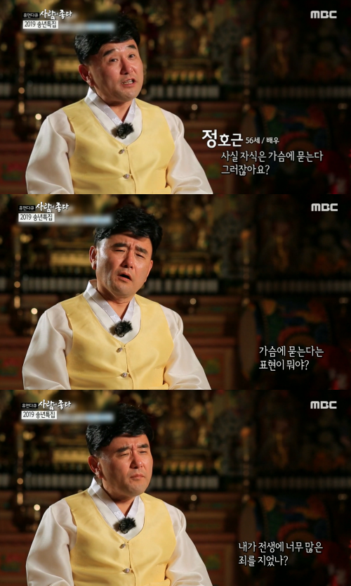 한편, 이번 방송에서 정호근은 신내림 받은 이유를 에피소드로 이야기 하며 자식을 언급했다. '옛날에 어른들이 자식이 죽으면 가슴에 묻는다고 표현을 했었는데 그때는 그게 무슨 말인지 몰랐다'라며 운을 띄웠다. '하지만 이제는 알 것 같다. 내가 전생에 너무 많은 죄를 지었나?'라고 독백하며 시청자들의 궁금증을 자아냈다.