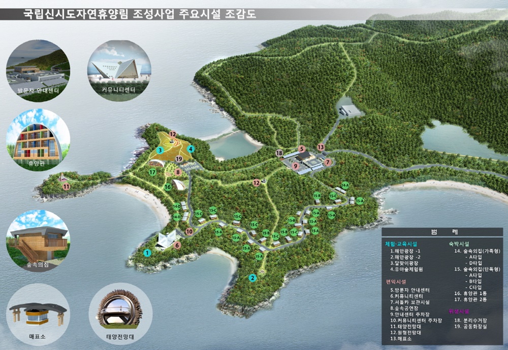 주요 시설로는 ▷국산 목재를 사용해 전통건축 상징성을 표현한 ‘방문자안내센터’ ▷신시도 밤하늘의 별을 형상화한 ‘복합커뮤니티센터’ ▷아름다운 낙조를 바라볼 수 있는 ‘태양전망대’ ▷바다 위에 떠 있는 달을 형상화한 ‘산림문화휴양관(2동 28실)’ ▷‘숲속의 집(28동 28실)’ ▷섬 전체를 전기 셔틀카로 순환할 수 있는 4㎞의 ‘섬순환로’ ▷‘유아숲체험원’ 등이 있다.