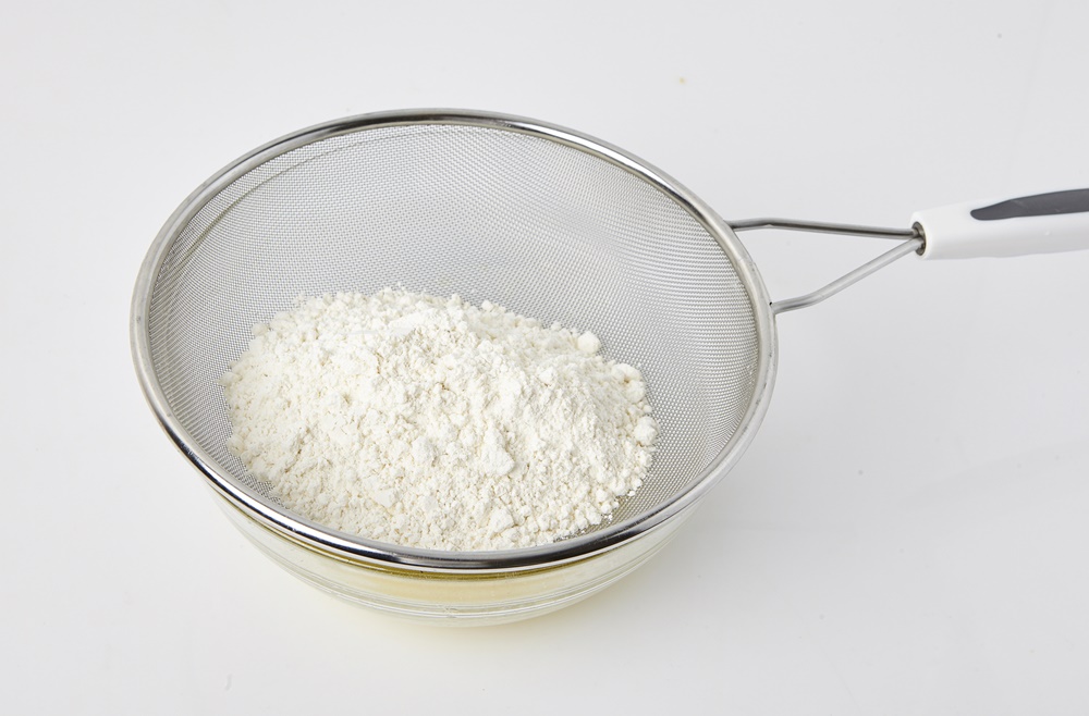 3. 박력분과 베이킹파우더를 섞어 체에 걸러 고무 주걱으로 가루가 보이지 않을 때 까지 섞는다.