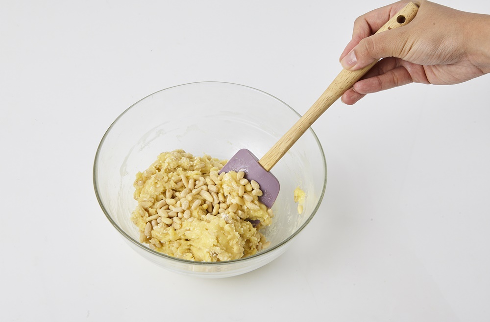 ▷주재료 : 잣(1컵), 달걀(1개), 설탕(45g), 식용유(25g), 박력분(120g), 소금(½작은술), 베이킹파우더(1작은술)