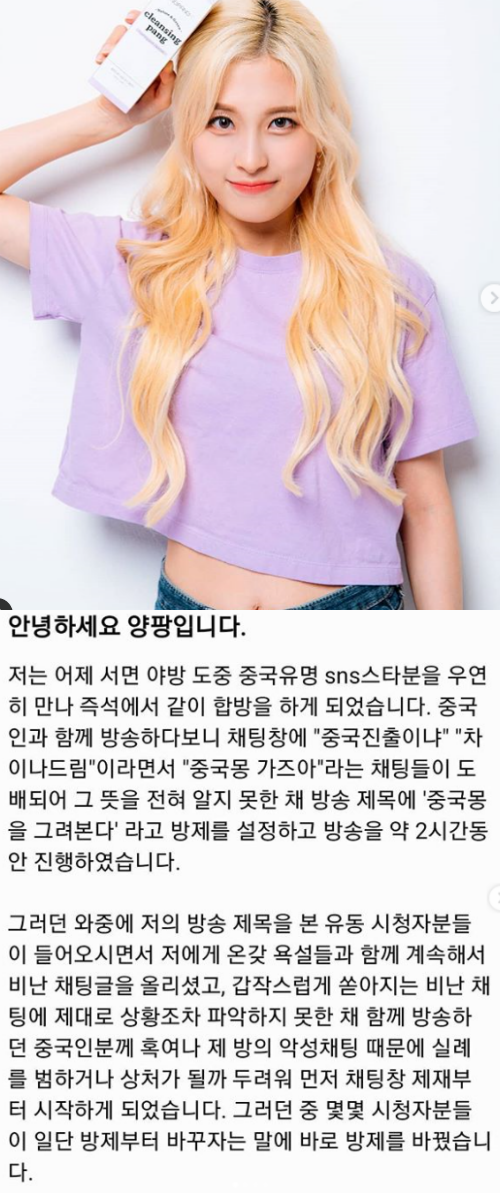 [환경일보] 김다정 기자 = BJ양팡이 연일 구설수에 오르며 사과문을 게재했다. 이번에는 '중국몽'이다.