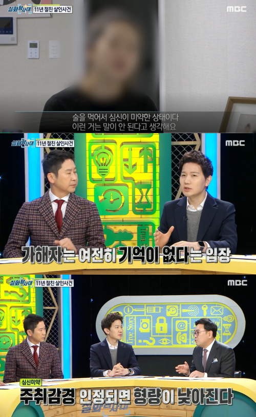 살해당한 성철(가명)씨의 아내는 여전히 지옥속에서 살고 있는 모습이 시청자들을 안타깝게 했다. 하루아침에 사랑하는 사람을 떠나보냈지만 가해자 측에서는 술을 마신 상태에서 벌어진 일이라 기억이 나지 않는다는 심신미약을 주장하여 ‘주취감경’을 강조한다고.