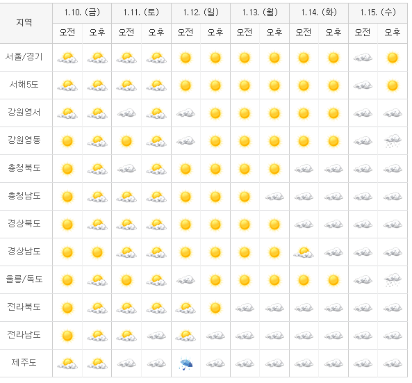 [강원도]15~16일은 영동지방에 눈이 예상되며, 그 밖의 날은 고기압의 가장자리에 들어 구름많은 날이 많겠습니다.