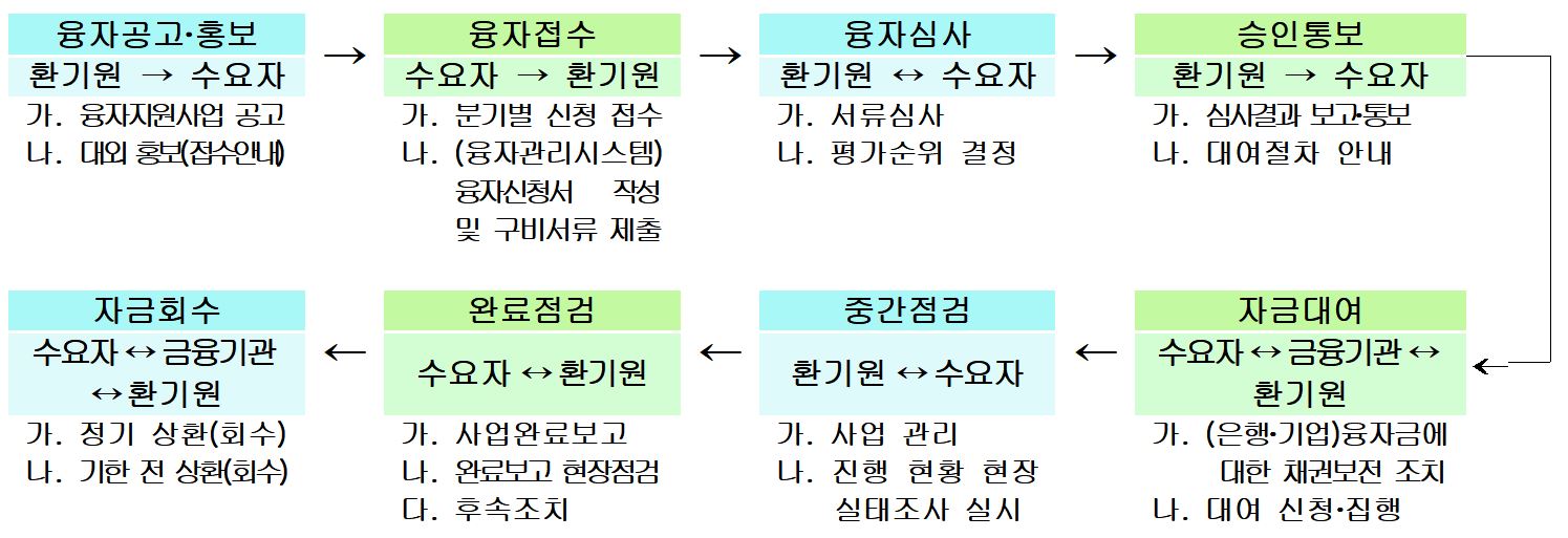 분야별로는 ▷재활용산업육성자금 1634억원 ▷환경개선자금 620억원 ▷환경산업육성자금 455억원 ▷천연가스공급시설설치자금 14억원이며, 융자신청 접수는 분기별로 진행된다.