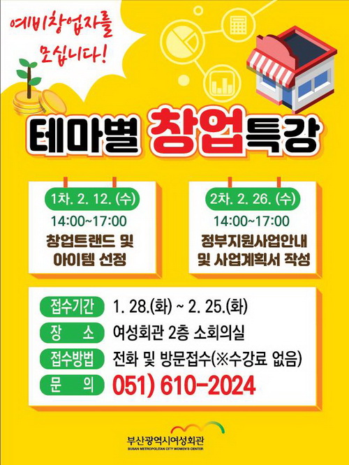 테마별 창업특강은 다음 달 12일을 시작으로 올해 말까지 총 6차례에 걸쳐 부산여성회관 소회의실(2층)에서 진행된다.