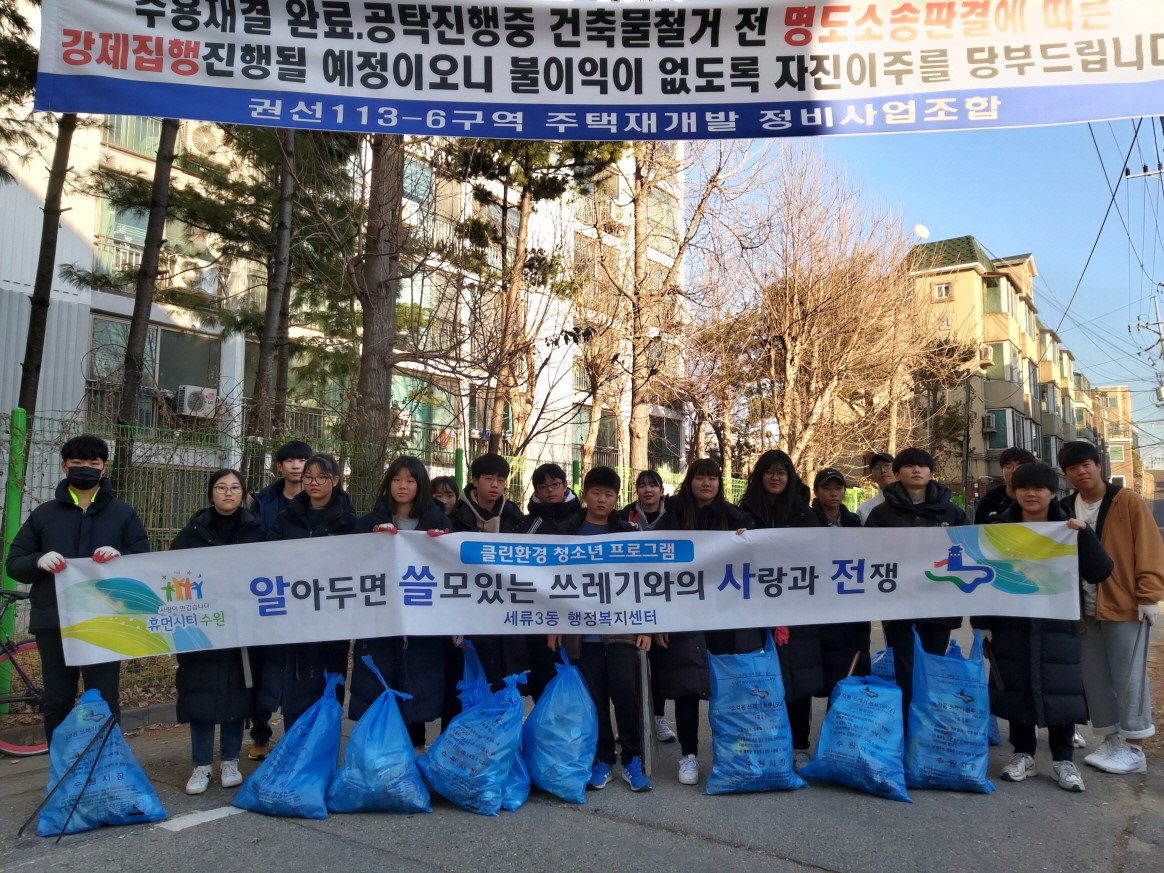 이번 활동에서 참여한 청소년들은 수원시 자원회수시설을 방문, 쓰레기 처리과정을 견학하고 상습적 무단투기로 몸살을 앓고 있는 세류3동 재개발 구역 정화활동을 실시했다는 구의 설명이다.