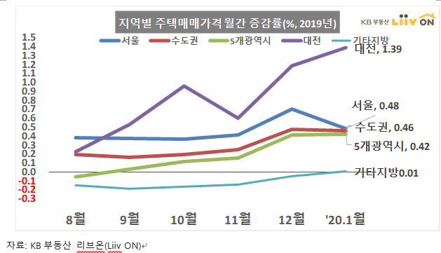 인천을 제외한 지방 5개 광역시는 대전(1.39%)이 매우 높게 상승했고, 대구(0.40%), 울산(0.25%), 광주(0.21%), 부산(0.14%)도 전월 대비 상승세를 보였다.