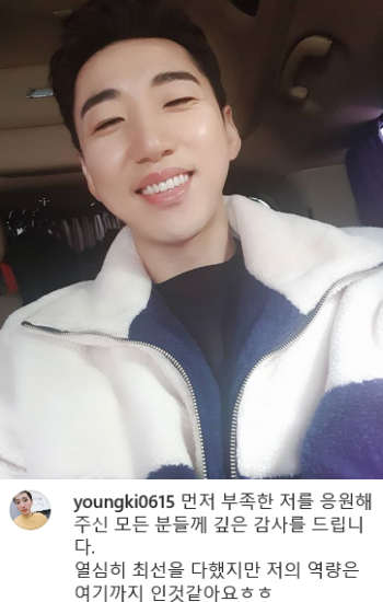 영기는 " 부족한 저를 응원해준 모든 분들께 감사합니다. 모든 참가자들에게 경의를 표합니다" 라고 소감을 밝히며 탈락의 아쉬움을 달랬다.